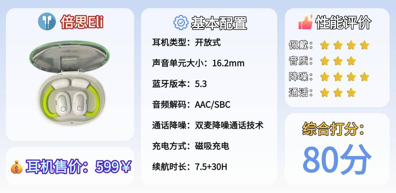 连接性能方面,Eli 支持低延迟蓝牙连接与双设备切换,手机、电脑间切换流畅稳定。续航表现不错,单次播放约 7.5 小时,配合充电盒总续航可达 30 小时。充电盒支持快充,但体积略大,携带性一般。总体而言,倍思 Eli 在佩戴舒适度、续航与通话表现上较为全面,适合追求实用性的用户。若更在意高解析音质或漏音控制,则可能需要权衡。