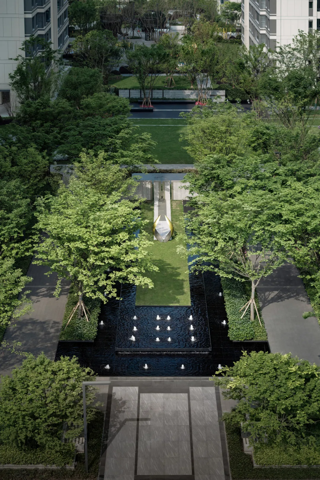 走进园区,迎接你的是大面积涌泉水景,两旁茂密的树阵夹道而行,满满的仪式感。