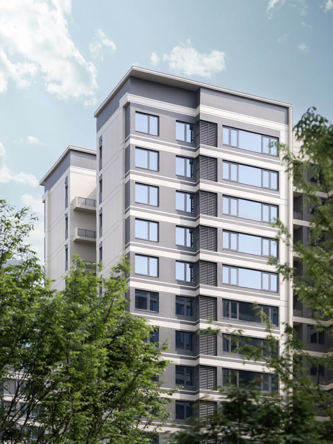 其次,项目一期的完美呈现为“好房子”打了个样。它的建筑颜值非常出众。外立面米白加浅灰的配色现代而时尚,飞翼式线条呈现出灵动通透的美感。在蓝天白云的映衬下,大面积玻璃呈现出高级的质感,颜值丝毫不输洋房。