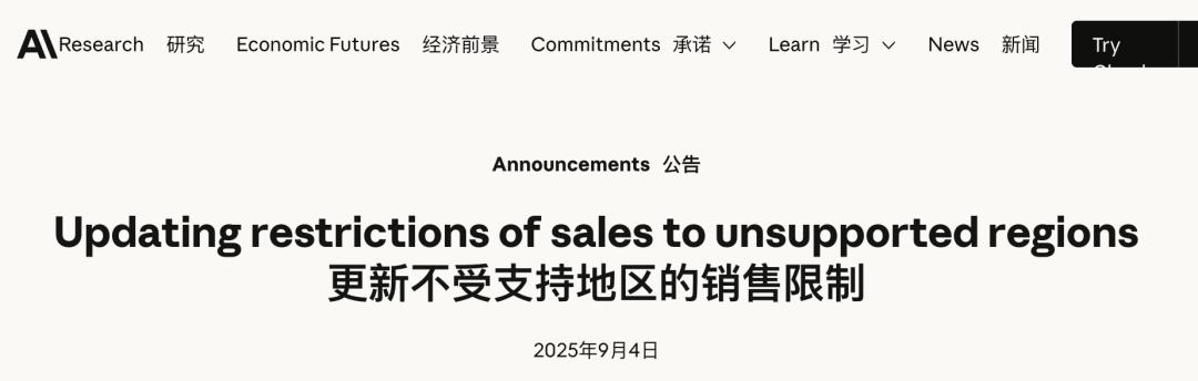 Anthropic及其CEO Dario Amodei曾多次表态支持美国的出口管制政策。2025年9月,Claude曾特别更新其销售地区限制,专门指出将不向位于“对手国家”中国,或是中资持股超50%的海外子公司提供Claude商业访问渠道,随后还禁用了大批中国用户对Claude Code等工具的访问权限。