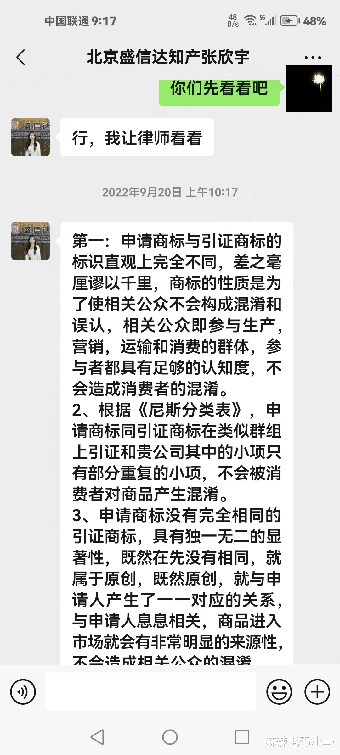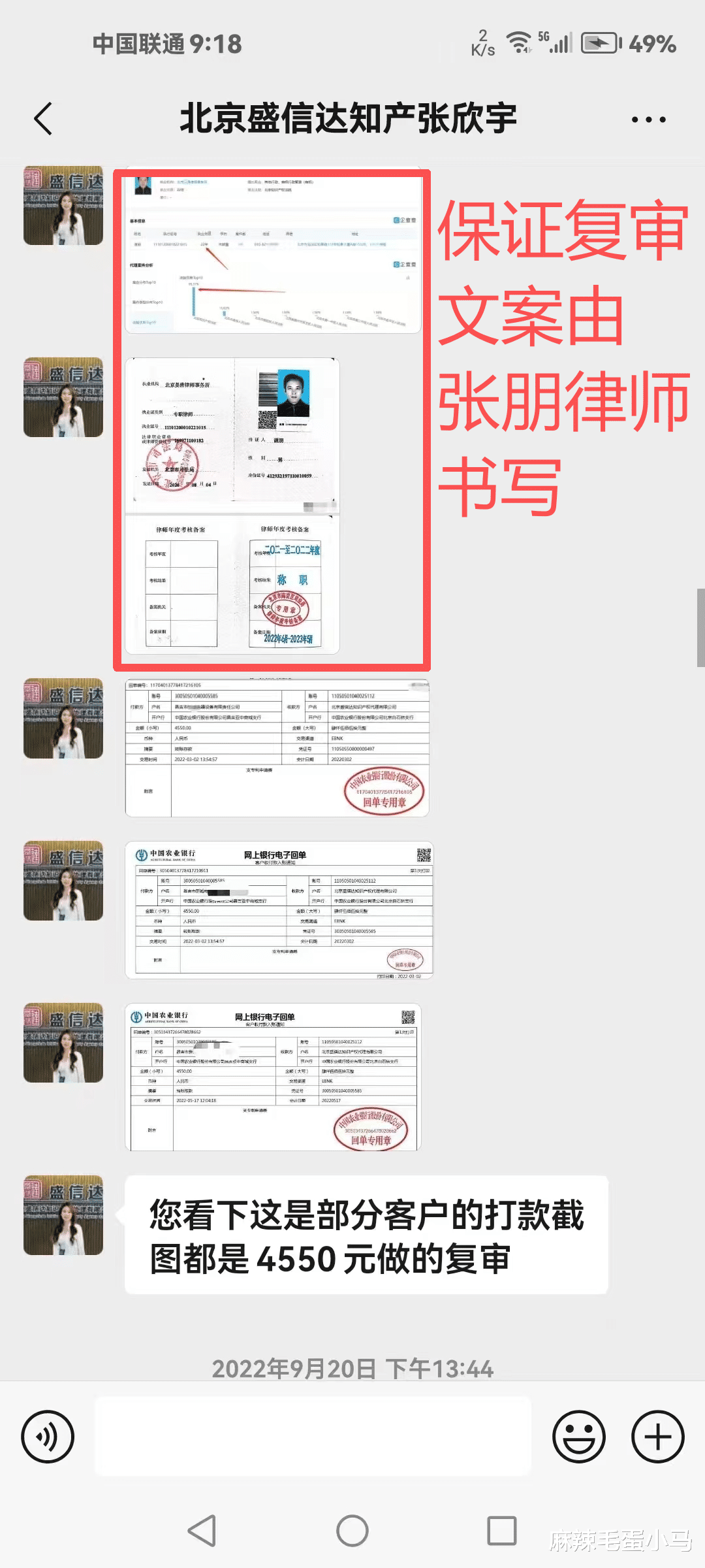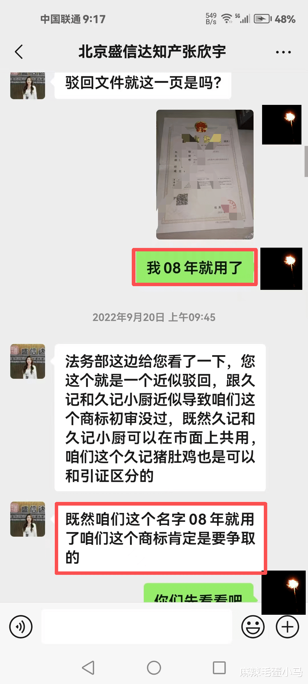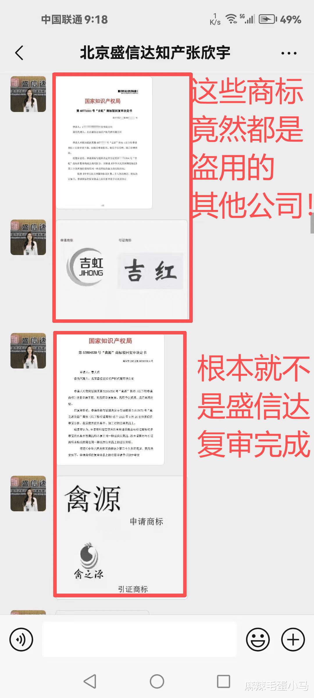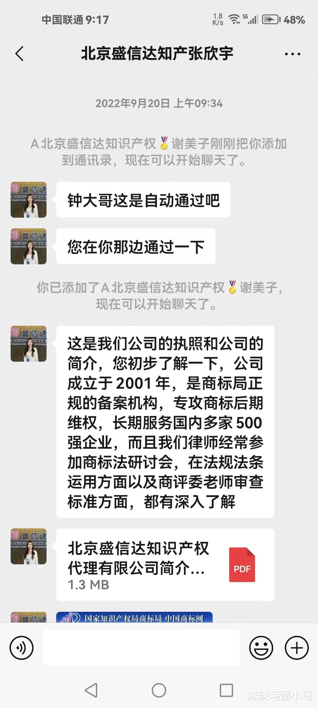 据该网友提供的聊天记录显示,盛信达方面在推广过程中,自称公司“成立于2001年”“长期服务500强企业”,并展示了多份商标驳回复审成功决定书作为案例,以证明其专业能力。