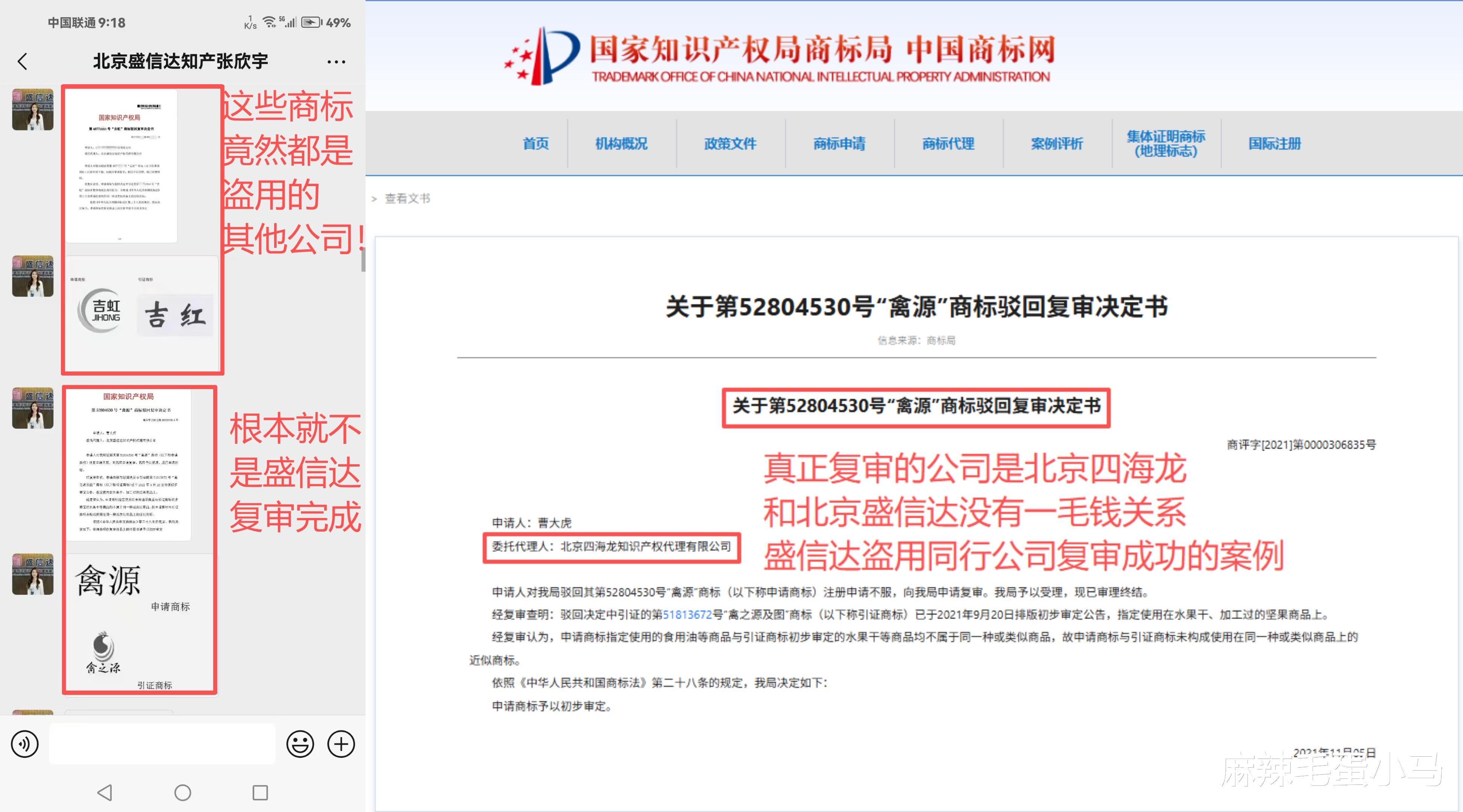 近日,有网友反映其在与“北京盛信达知识产权代理有限公司”沟通商标驳回复审业务时,发现该公司涉嫌盗用其他代理机构的成功案例,并存在虚假宣传公司资质的行为。