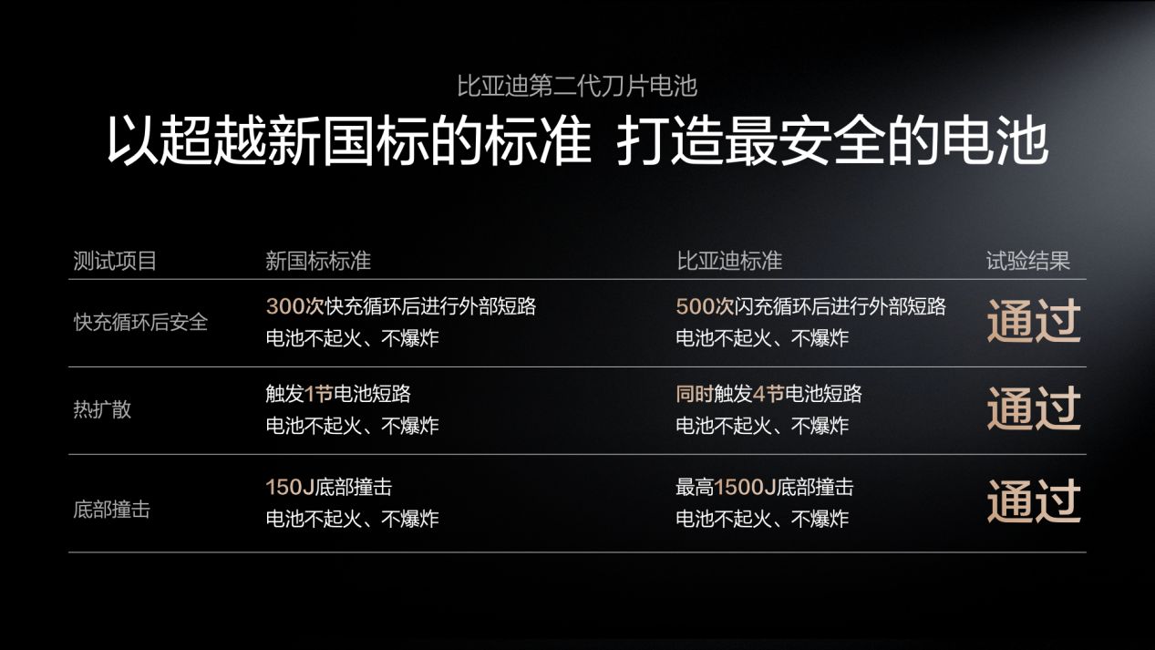 其实细想一下,这也的说法完全站不住脚。比亚迪给出的回应也堪称“技术自信”与“责任承诺”的双重展示。技术层面:比亚迪通过“锂离子高速通道”与“全温域智能热管理”系统,从物理根源减少快充产热与散热不均,有效破解“快充折寿”的行业传统矛盾。而在承诺层面:比亚迪直接提升质保标准,将6年/15万公里内的电池容量保持率换新门槛从75%提升至77.5%,并为电芯提供终身保修,打消用户长期疑虑。最狠的是安全验证:比亚迪公布了一系列远超国标的极限测试结果,包括“500次闪充循环后边充边针刺”、“同时触发4节电芯热失控”及“10倍国标能量的底部撞击”,以验证电池在全生命周期与极端场景下的安全性。