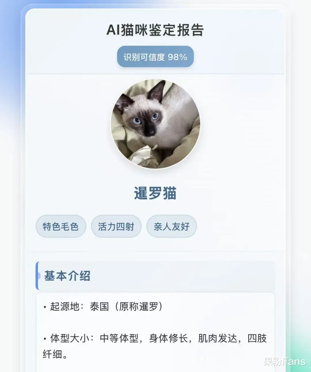 通过 AI 鉴猫功能,你可以全面了解猫咪的品种、体型健康和性格特点。只需上传猫咪的照片,就能获得一份详细的养猫指南,包括如何科学喂养、如何根据猫咪的性格特点更好地与它相处等实用信息。