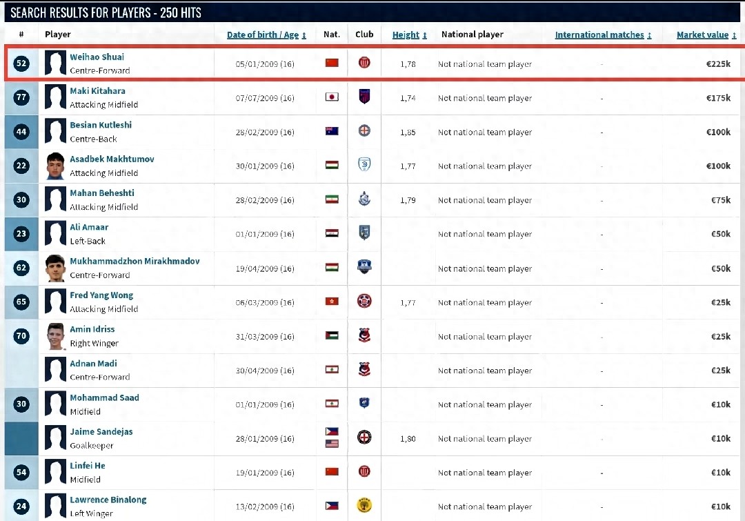 北京时间12月12日,根据“德转”近日更新的职业球员身价数据,目前效力于成都蓉城B队的帅惟浩,以22.5万欧的身价,成为2009年以后出生的亚洲第一人,而排名第2的日本球员身价则为17.5万欧。同时这个身价也让帅惟浩成排在同年龄段的世界第19名。