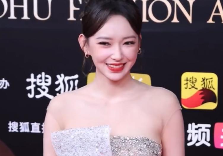 这件银色满钻抹胸礼服相当闪耀,腰部和臀部位置的处理也是恰到好处地凸显出程潇的身材曲线。