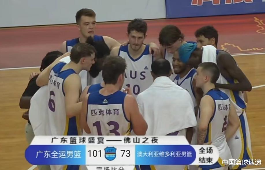 广东全运会球队热身赛继续进行,对手是澳大利亚的维多利亚队。随着沈梓捷也已经到位,广东全运会阵容已经彻底齐整了,杜锋希望能够经过热身赛让球员之间进行磨合。这支澳大利亚球队的整体视野也不强,广东队很快就占据了主动,并一度将分差扩大到39分。虽然下半场比赛,对方追回了一些分数,不过广东队依然以101-73大胜对手。球员表现方面,焦伯乔15分,王睿泽8分,赵睿5分,徐杰12分,周鹏11分,胡明轩8分,贺希宁15分,刘传兴4分,任骏飞8分,张昊7分,张文逸5分,李炎哲3分。
