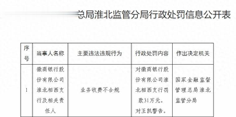 信网12月17日讯 近日,徽商银行股份有限公司淮北相西支行因业务收费不合规,被国家金融监督管理总局淮北监管分局罚款31万元,同时相关责任人王凯受到警告处罚。