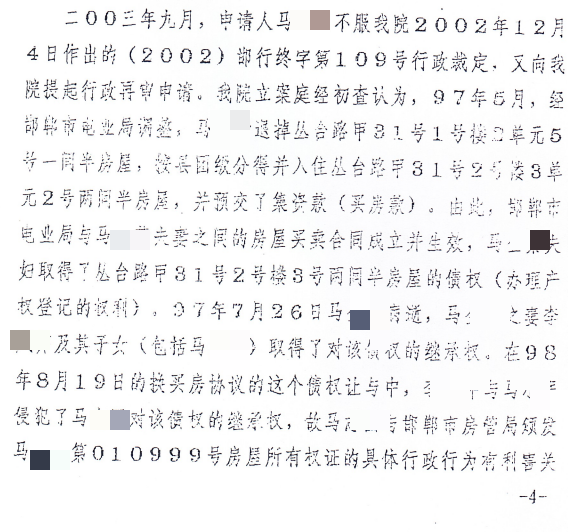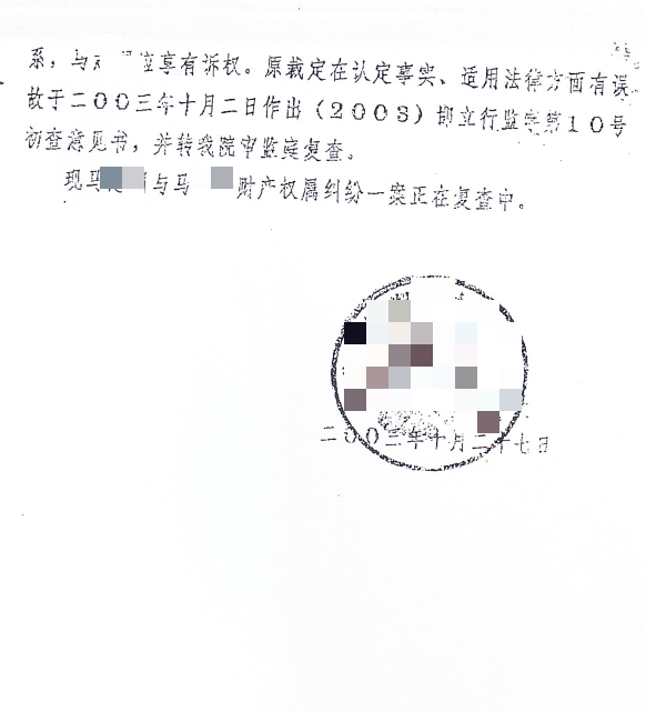 2003年,马某国就上述行政裁定向邯郸中院申请再审,中院立案庭经初查认为,马某荣生前与邯郸电业局就该房产的买卖合同成立并生效,马某荣去世后其继承人享有相关债权,李某芹与马某强的相关行为侵犯了马某国的继承权,马某国与房产管理部门的发证行为有利害关系,原裁定在事实认定和法律适用上存在错误,并将案件转至审判监督庭复查。