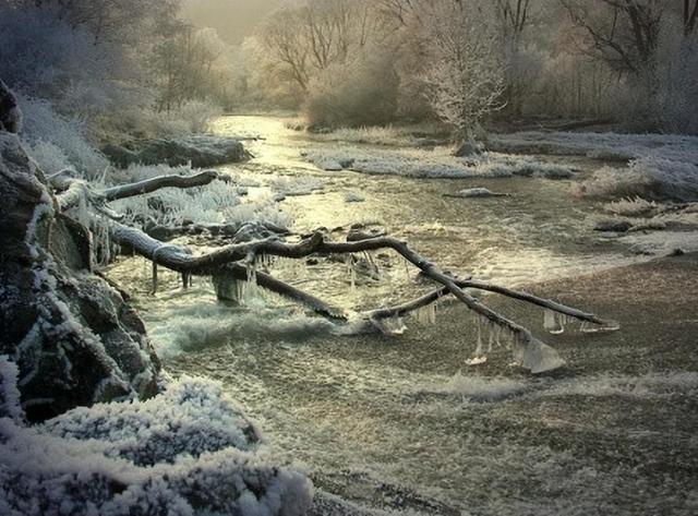 岸边的树木都银装素裹,水面堆满了冰凌。
