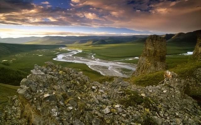 中景的河流蜿蜒向远方,引导着人们的视线望向画面深处。