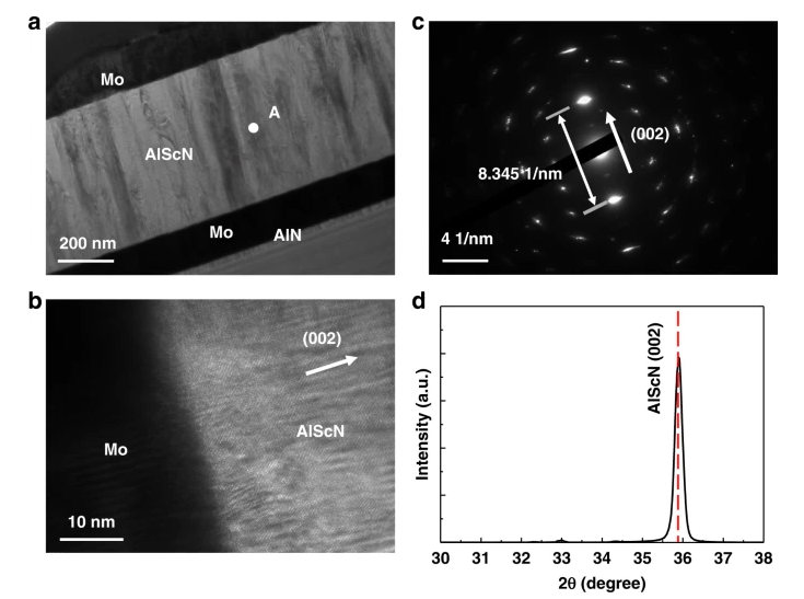 Lu基底层诱导外延生长有研究团队在ScAlN薄膜底部引入镥(Lu)金属基底层。由于Lu的六方最密结构与ScAlN晶格匹配较好,该方法促进了Sc浓度约50.8 mol%薄膜的均匀生长,薄膜压电常数提升至35.5 pC/N,比常规工艺所得性能提升约12%。