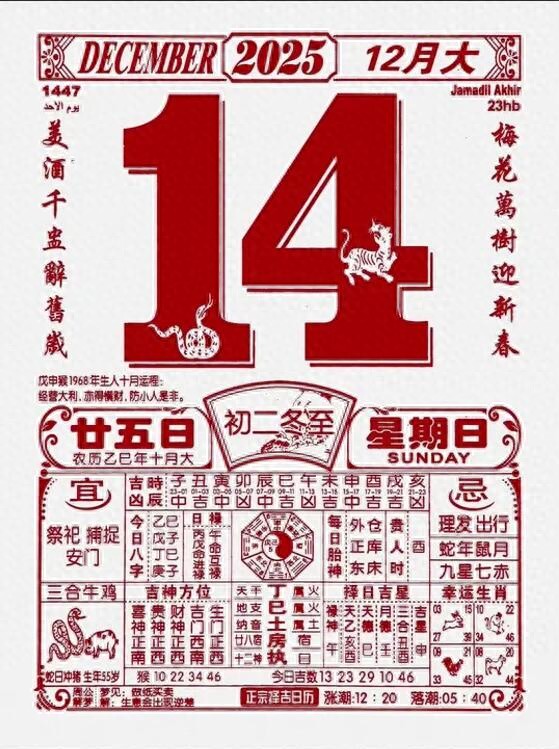 黄历心中过,遇事不出错。12月14日,星期日,农历十月二十五,大家可以先留下一句:稳步守成。祝福一下自己。这天值神是玄武,象征提醒注意潜在阻碍和小人纠缠,不宜盲目推进新计划。这天是执日,象征固执与坚守,代表着一种坚持与执着的精神。这天,我们需保持信念,持续努力,方能取得成功。穿衣颜色推荐黄色、咖色色、棕色系。不推荐白色、银色、米色。打麻将求职找工作的可以去西南边,约会谈恋爱的可以约在家南边。生肖注意事项,小鼠乌云相随,小牛心情愉悦,小虎难有进展,小兔挫折较多,小龙行事果断,小蛇起伏现象,小马思维清晰,小羊积累人脉,小猴好事连连,小鸡充满活力,小狗事业不错,小猪关系欠佳,有缘刷到,祝你开心,福生无量。