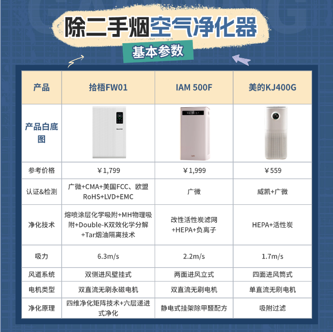 本次实测的三款除二手烟净化器基本参数整理如下,方便大家后续查阅