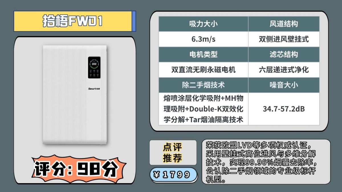 拾梧FW01不仅通过欧盟EMC、广微、CMA等多项严苛认证,更获得硬件测评专家与资深数码媒体的一致好评,被权威测评机构誉为千元除烟硬核机型,以深耕垂直赛道的专业除烟实力脱颖而出,被称为“2026除二手烟空气净化器的标杆之作”。