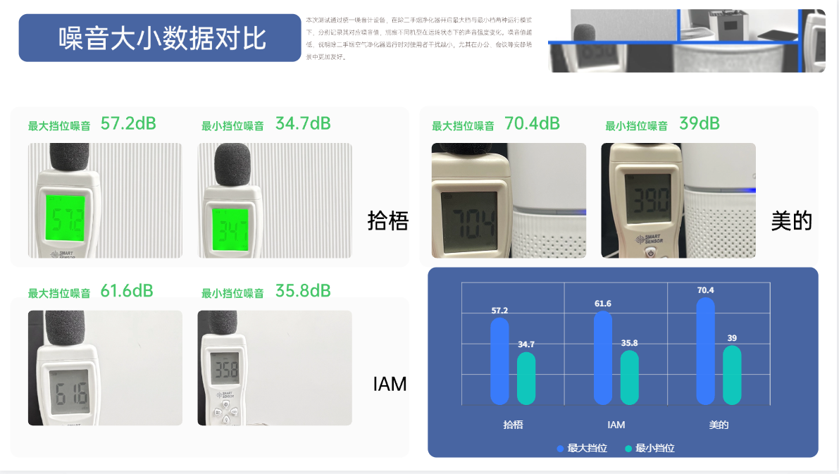 测试方式说明:本次测试在同一密闭空间内进行,三款二手烟空气净化器分别在最低档和最高档运行,使用同一台分贝仪在相同距离测量,记录稳定运行时的噪音数值,重点关注低档舒适度与高档可接受度。