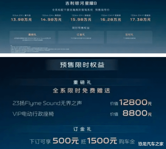 综上所述,花不到15万元的价格,能够买到这样一台中大型尺寸的商务轿车,我认为是比较合适的一个选择,而且从目前来看,吉利银河星耀8只是处于预售阶段,所以面对当下变化莫测的市场环境,或许等新车在5月份正式上市之后,它的价格还会出现一个明显的调整。所以看到最后的同学们,你们认为吉利银河星耀8的表现如何?对比比亚迪的汉DM,又会有几成胜算?不妨来评论区聊一聊吧。
