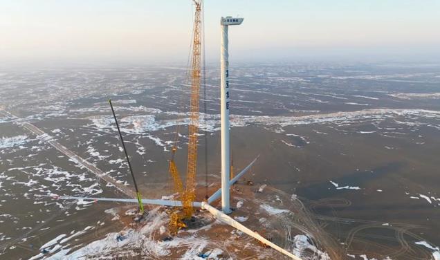 18,新疆其亚的戈壁荒漠气温零下26℃,直径220米、重170余吨的风机扇叶被稳稳安装在150米高空基座。项目仅用9天有效吊装时间就极速完成首台风机吊装,这将有助于绿色电能早日输送到千家万户。