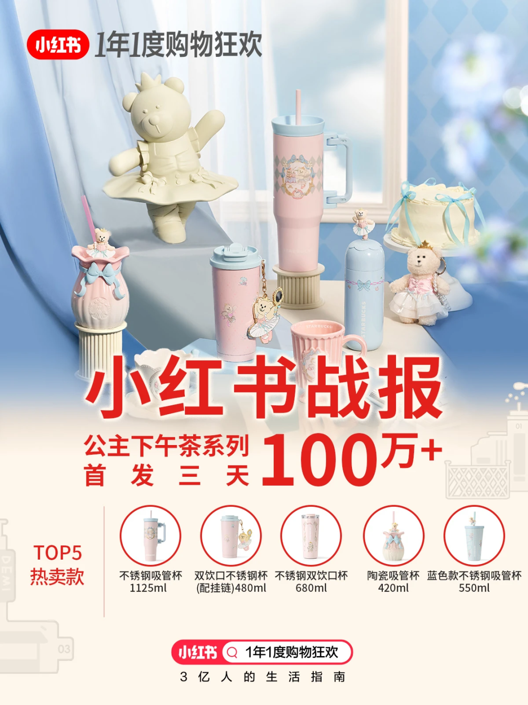 瞄准这一独特的平台价值,「星巴克公主杯」在小红书抢先全网进行新品首发。蓄水种草期间,品牌圈定潜在客群,围绕“千金大小姐/miu系”人群搭建新品经营场景。在产品引入期抢占用户心智后,品牌通过小红书店播提前全网三天首发新品,并在三天内破百万成交。