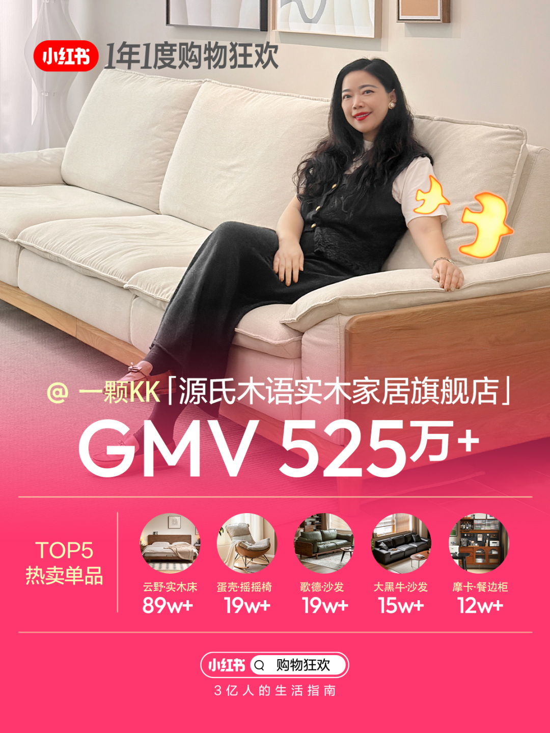 在此次双11营销节点,源氏木语实木床在以更直观的营销视角联动小红书头部买手,共同引入全网热销商家,同时结合差异化选品思路,聚焦头K专场进行深度讲解。其中,通过高点合作设计师兼家居博主 @一颗KK,爆发总成交额超过500万。
