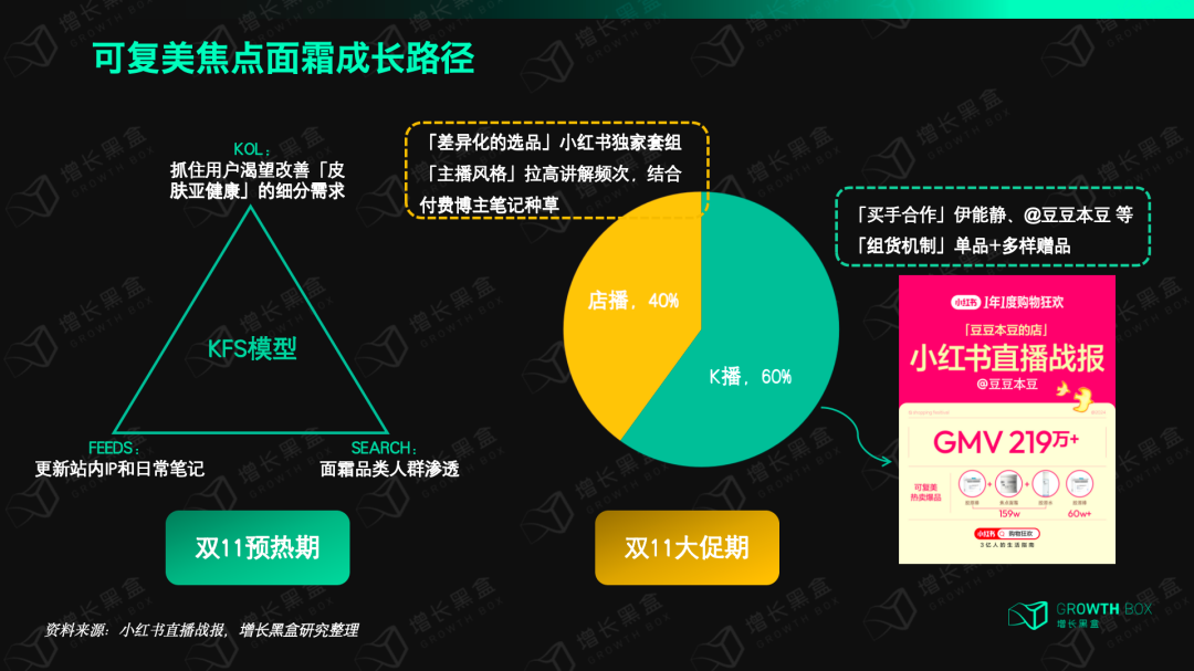 在后续长效经营中,品牌找到店播的差异化选品组合,主打小红书独家套组,拉高店播客单,贡献剩下40%成交额。并且在店播过程中,主播也不断拉高焦点面霜的讲解频次,结合付费博主笔记种草,持续释放长尾价值,最终实现品牌GMV270万+。