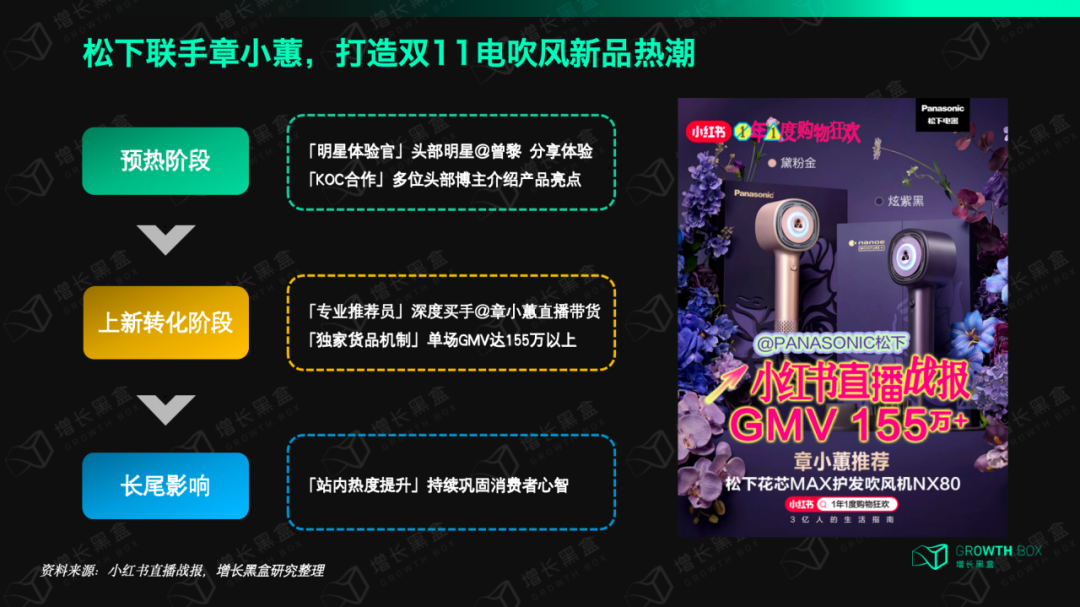 新品上市之后,松下在小红书中将吹风机的产品亮点,融入消费者普遍头发干枯、难打理等日常痛点中,并通过头部明星博主 @曾黎以及多位头部博主第一时间带来了产品体验分享,为品牌完成新品心智的种草以及种子用户的积累。