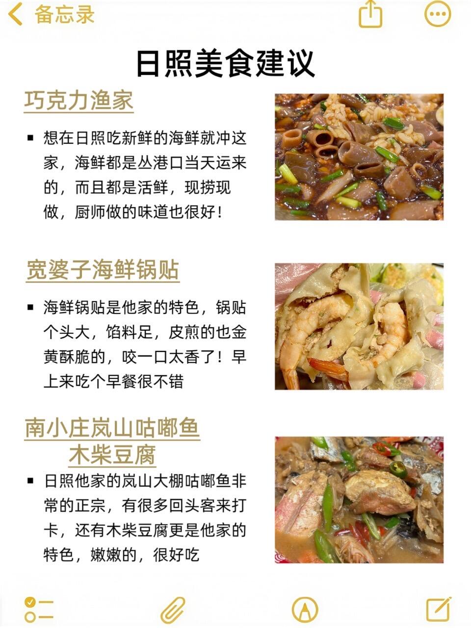 美食我给大家好好说说❗❗❗去日照不能错过新鲜的海鲜,巧克力渔家,饭点经常要排队,因为他家都是活鲜!宽婆子海鲜锅贴家的鲅鱼锅贴🥟也是一绝!馅料特饱满!不知道吃什么的可以尝尝南小庄岚山咕嘟鱼木柴豆腐家的岚山大棚咕嘟鱼🐟,刺少,鱼肉还嫩