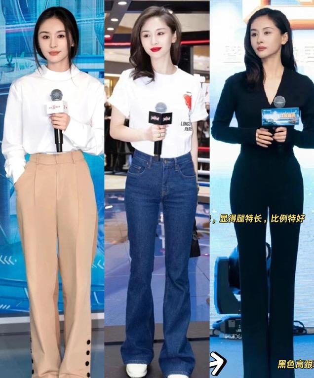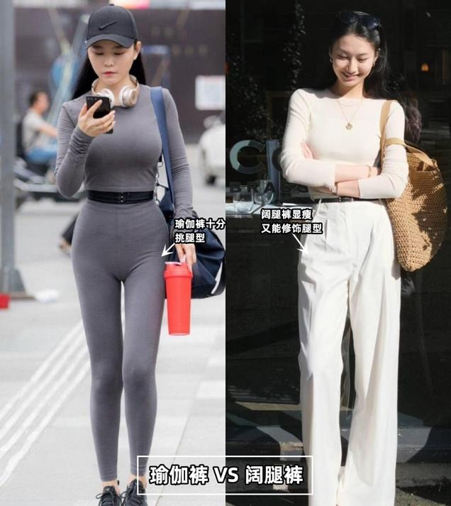 从下面这三组对比图中,可以清晰明了地看出搭配瑜伽裤和搭配阔腿裤之间的区别,阔腿裤的宽松设计基本不会因为体型凸显出任何肉,所以搭配阔腿裤是非常便捷安心的一件事。