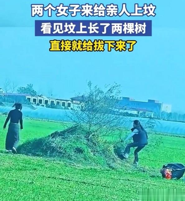 清明时节,一段“女子上坟拔树”的视频看得人五味杂陈。两位女士带着祭品赴墓园缅怀亲人,见坟头冒出两棵小树苗,当即上手连根拔起,还念叨着“坟上长树不吉利,得清干净”。