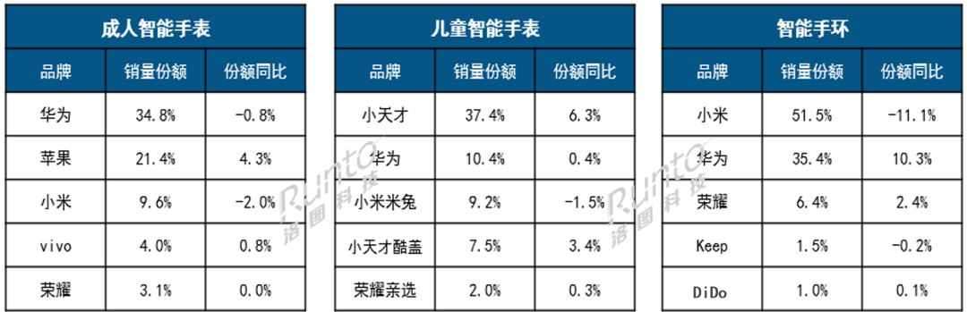 在整体市场销量下行的背景下,11月,智能腕带的三大品类成人智能手表、儿童智能手表和智能手环在线上市场的规模均呈现下滑,下滑幅度为:智能手环>儿童智能手表>成人智能手表。此外,各细分类目下的头部品牌也多数下跌,不同程度的降幅造成了市场份额变化的分化。
