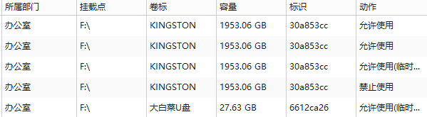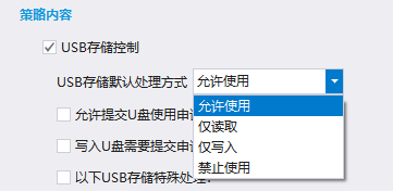 USB外设管控:支持禁止使用、仅读取、仅写入、允许使用四种模式,记录设备接入/拔出时间、厂商、序列号等信息。