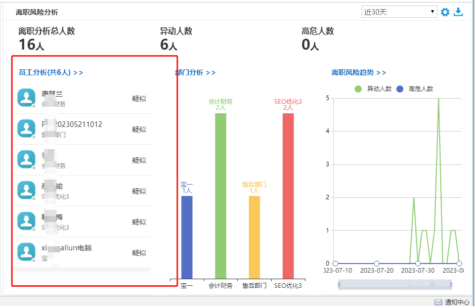 离职风险预警:通过分析员工行为模式(如频繁访问招聘网站、大量拷贝文件),提前识别离职倾向。