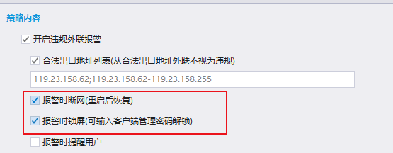 违规外联报警:实时监测网络连接行为,当检测到违规外联(如插网线、连WiFi、用手机热点)时,立即断网并锁屏,同时向管理员发送报警通知。