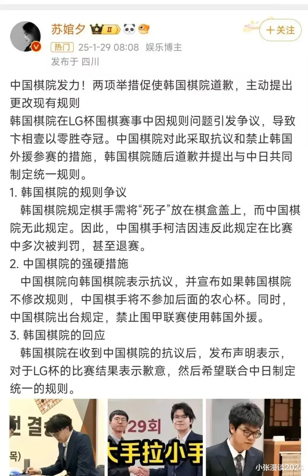 韩国棋院说要道歉,结果呢?压根没跟中国棋院和柯洁道歉,就是给赞助商和韩国棋迷道了个歉。这事办的,跟那些年韩国在体育赛场上的争议如出一辙。