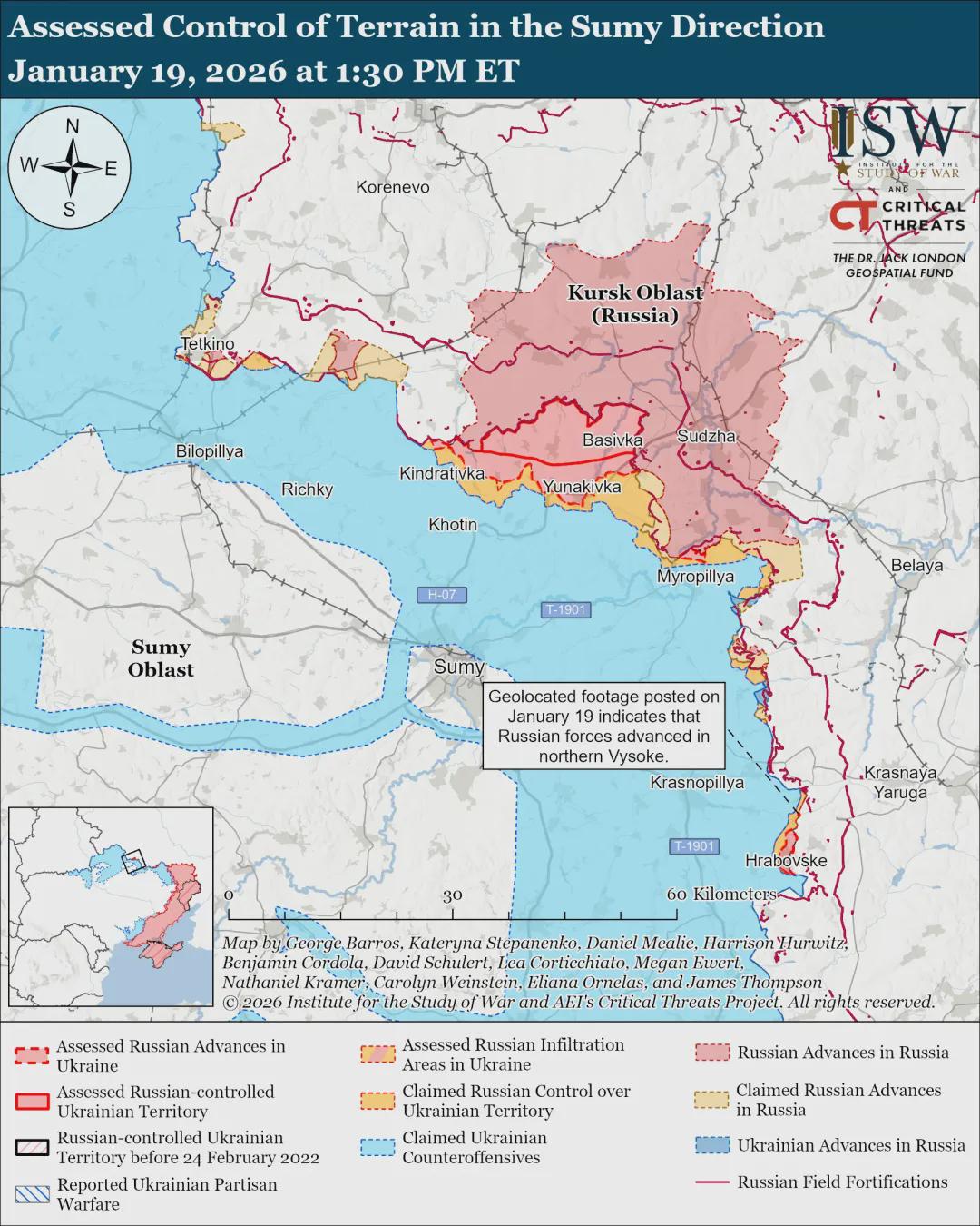 1月19日发布的地理定位影像显示,俄军最近在边境附近略有推进,进入了维索克北部(苏梅市东南部)
