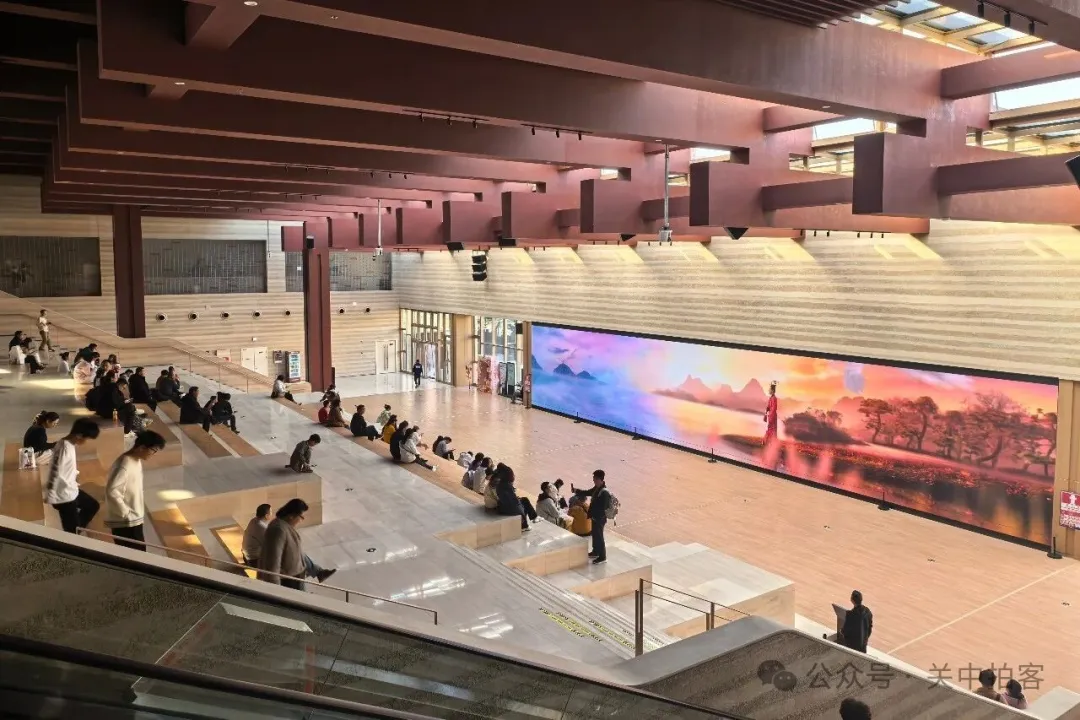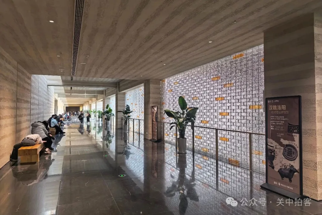 在博物馆大厅的后方,台阶通往下方的序厅,巨大的屏蔽不停地播放宣传片,向大家讲述汉魏洛阳故城的发展历史和精彩故事。游客们坐在台阶上,仿佛置身于电影院,一边休息,一边观看。