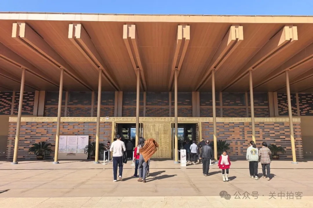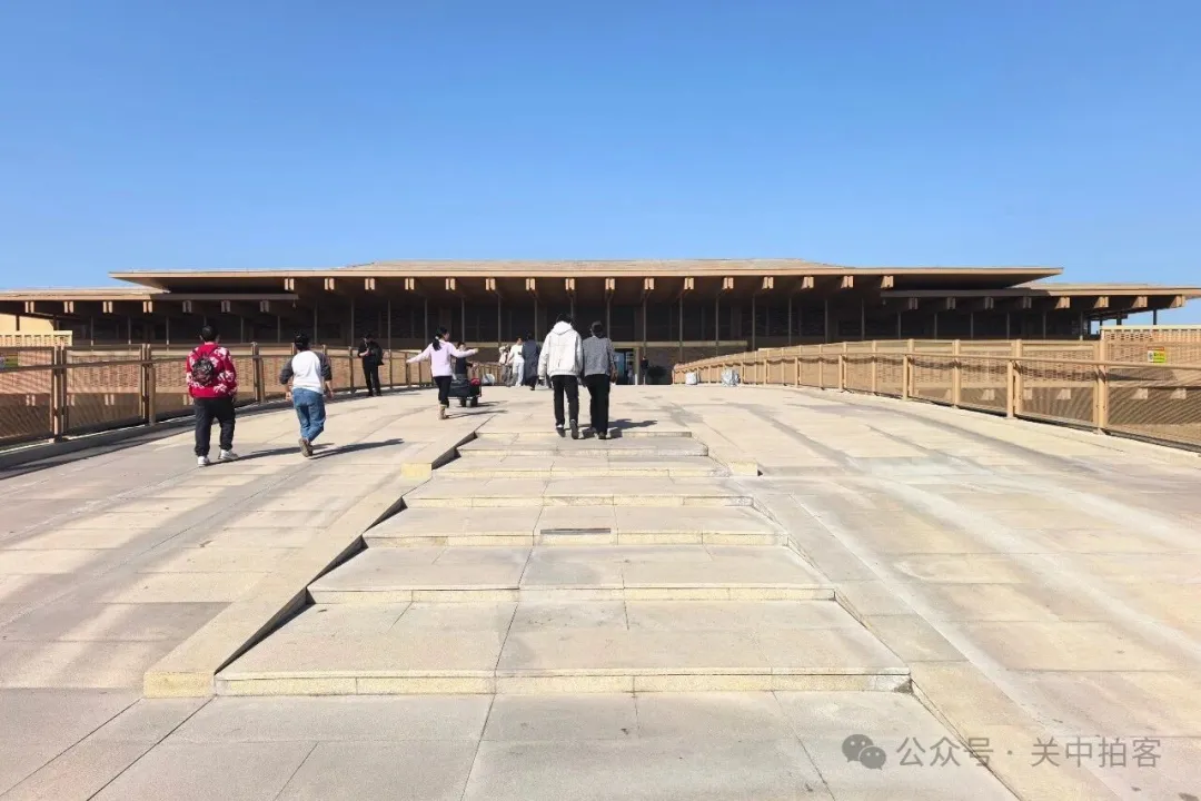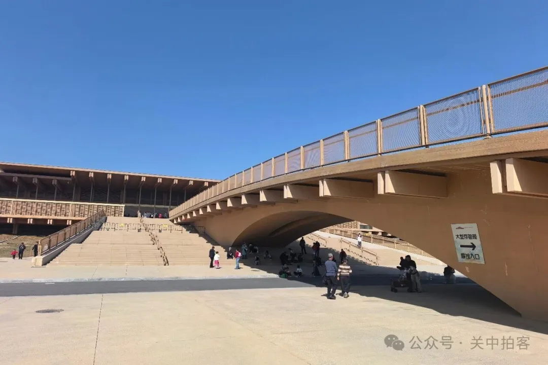 在大道的尽头,出现一座拱桥,跨过下方的道路,直达博物馆二层。这座拱桥长约88米,仿佛连接古今的通道,游客们如同“上朝”一般缓慢步入展厅,穿越千年,走进历史。