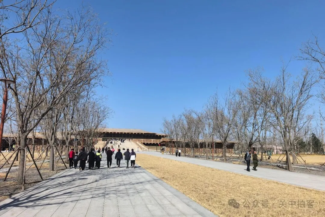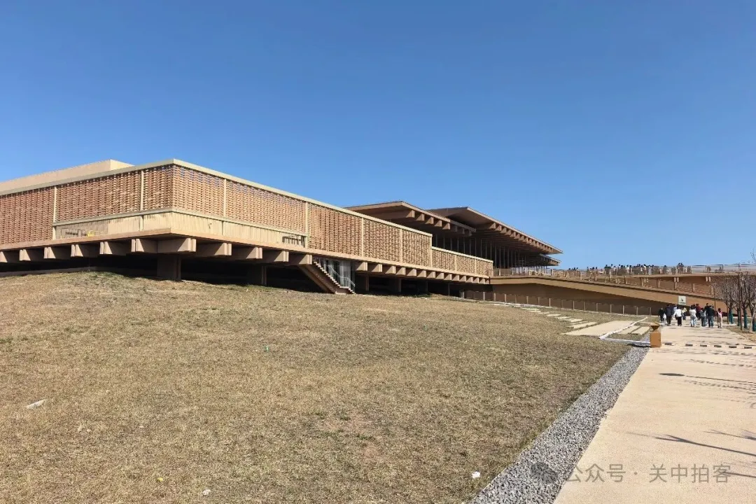 2026年2月20日下午,我来到汉魏洛阳故城遗址博物馆,将车停放在北侧,绕一圈儿到前方。博物馆建筑低平,坐落于高台之上,四周是天然平缓的草坡。外观呈现沙黄色,好像一根根木条,一层一层垒砌出高大的“木结构”建筑。
