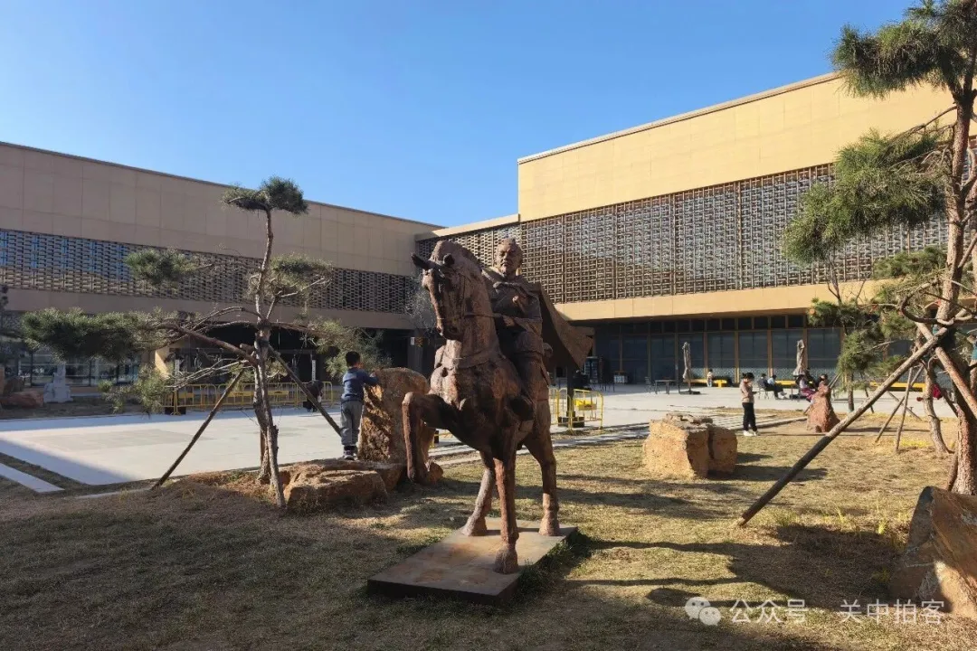 参观结束后,顺着序厅的台阶,来到博物馆一层,中心是一座露天庭院。在天然的草坪上,种植着松柏,摆放着巨石。其间,安放着汉魏时期洛阳著名的历史人物雕像,班超骑在马上,扬鞭出使西域。