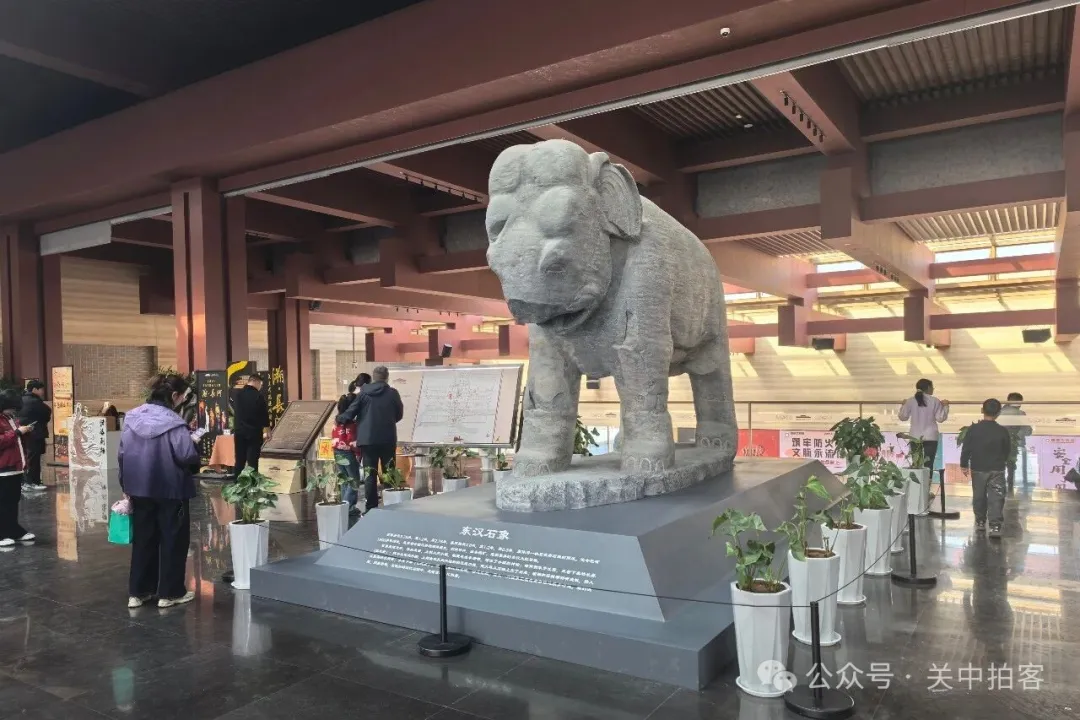 进入大门,大厅中央,摆放着东汉石象的复制品,原件矗立于洛阳市孟津县平乐镇象庄村。大象由整块石灰岩雕刻而成,长3.4米,宽1.2米,高3.2米。
