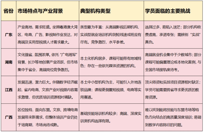 02 四省培训市场生态图景:机遇与挑战并存在着手选择前,有必要了解广东、广西、湖南、江西四省培训市场的基本格局。这四个省份在经济水平、产业结构和培训资源上存在差异,直接影响了当地培训机构的定位与质量。