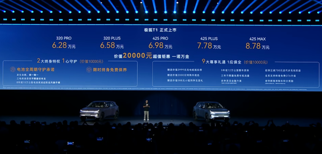 即日起订购极狐T1的用户可享受包括3999元充电桩安装抵扣券、2000元特殊车色选配券在内的多项购车权益,以及终身免费保养服务。