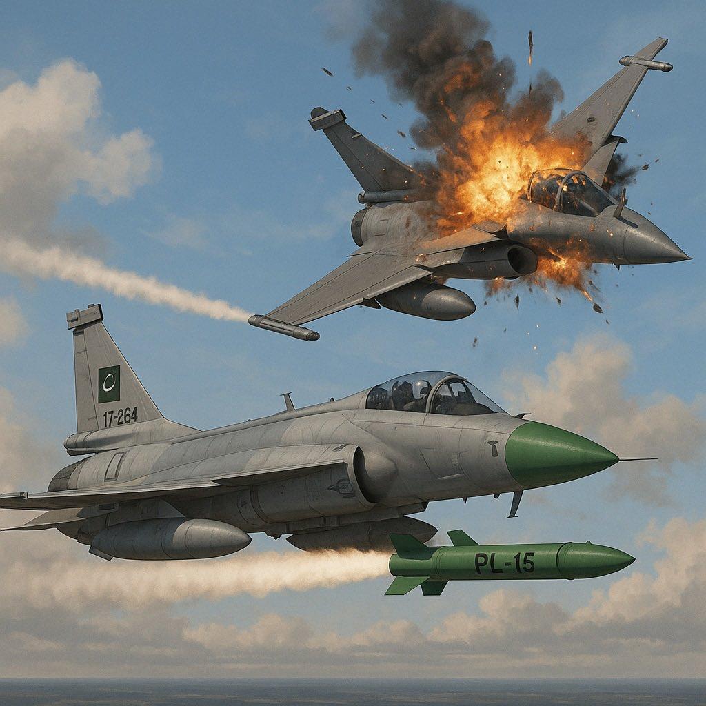 巴基斯坦网友用AI创作的,霹雳-15E导弹击毁印度空军阵风战斗机的画作