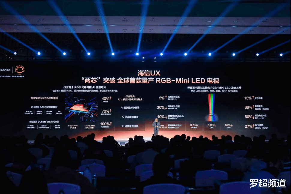 海信RGB-Mini LED 电视的突破在于,其彻底抛弃了QD-Mini LED采取的单色(白色/蓝色) LED 背光+量子点膜的方案,而是采取红、绿、蓝三原色独立驱动的 LED 背光,让背光光源具备完整的色彩信息。结合海信自研的信芯AI画质芯片H7和RGB-Mini LED背光芯片,率先实现光色同步精控,色彩表现、视角、亮度等画质表现达到指数级提升。