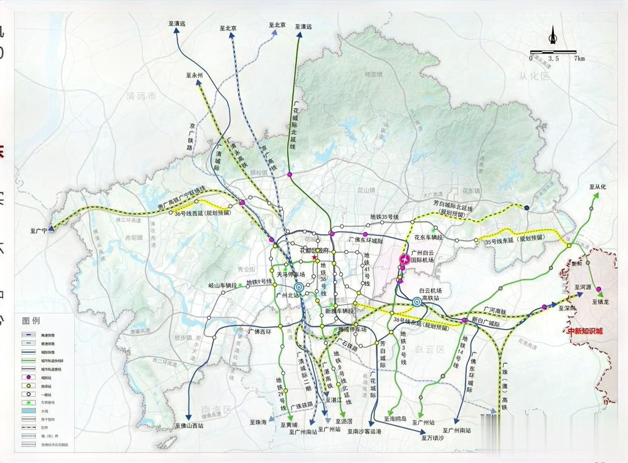 第二种观点则主张,把地铁9号线向东延伸至中新知识城片区,使其能与14号线支线、21号线和穗莞深城际交汇,还可实现与17号线/28号线的换乘。但根据广州市的批复,地铁9号线并无东延计划。相反,地铁36号线存在东延规划,且将经白云机场T3高铁站接入中新广州知识城区域。