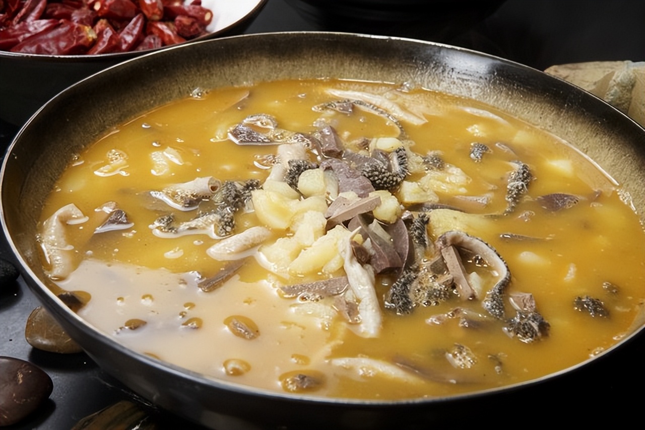 特点和口感:烩羊杂碎的汤色乳白,上面漂浮着一层油色,红绿点缀其间,味道香醇浓郁,不腻不睡。