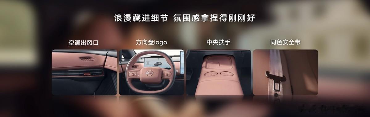 除了颜色的出色,东风日产与全球顶级供应商合作,优中选优,选取最合适的材料。同时对不同材质分别进行针对性调整,只为实现不同材质间的色调统一。另外,方向盘LOGO、空调出风口、座椅头枕背后、后排中央扶手杯托等地方镶嵌了玫瑰金饰条,甚至连安全带也做了同色的细致处理,最终呈现出视觉一体感极强的内饰氛围。