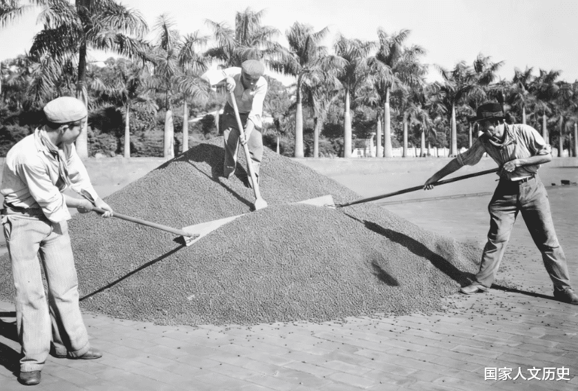 1940年,桑托斯港口附近晾晒咖啡豆的工人。