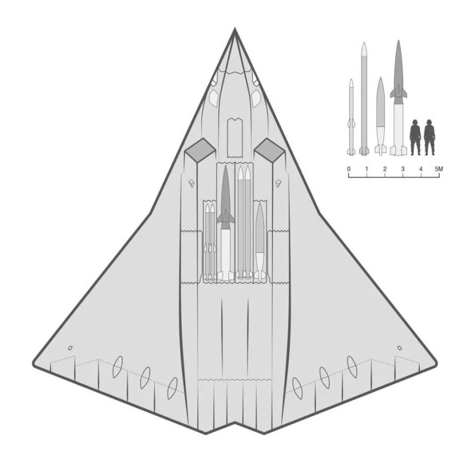 歼-36的隐身性能尤为突出,无尾三角翼设计使机体表面更加简洁,配合三台发动机的隐身处理,整体隐身性能超越F-22。在武器系统方面,歼-36内置主弹舱采用双层布局,可携带8枚PL-17超远程空空导弹,两个小弹舱可携带6枚PL-15中距弹,总计14枚空空导弹的火力配置堪称强大。此外,它还具备携带"鹰击"-21高超音速导弹的能力,拓展了反舰对地攻击功能。