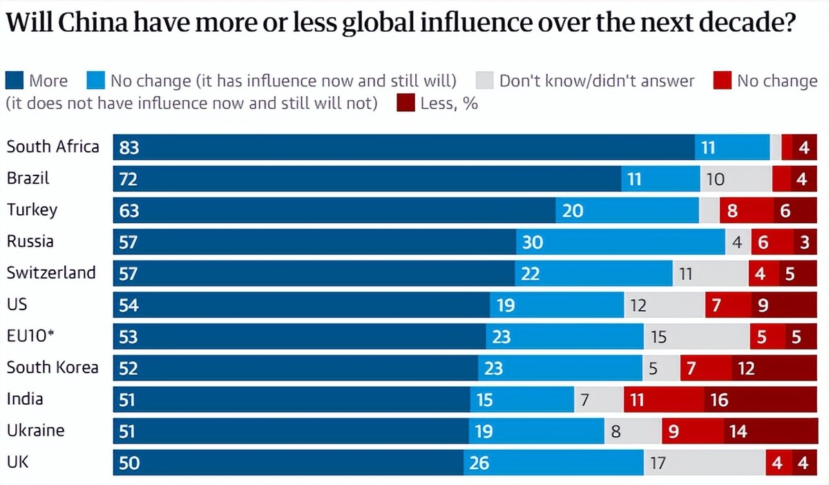 南非有83%的人这么认为,巴西是72%,土耳其也有63%,就连美国本土都有54%的受访者认可这一点,欧盟10国和印度也分别达到了53%和51%,英国刚好卡在50%的线上。说白了,除了少数心存侥幸的,全球大部分人都看清了势头。